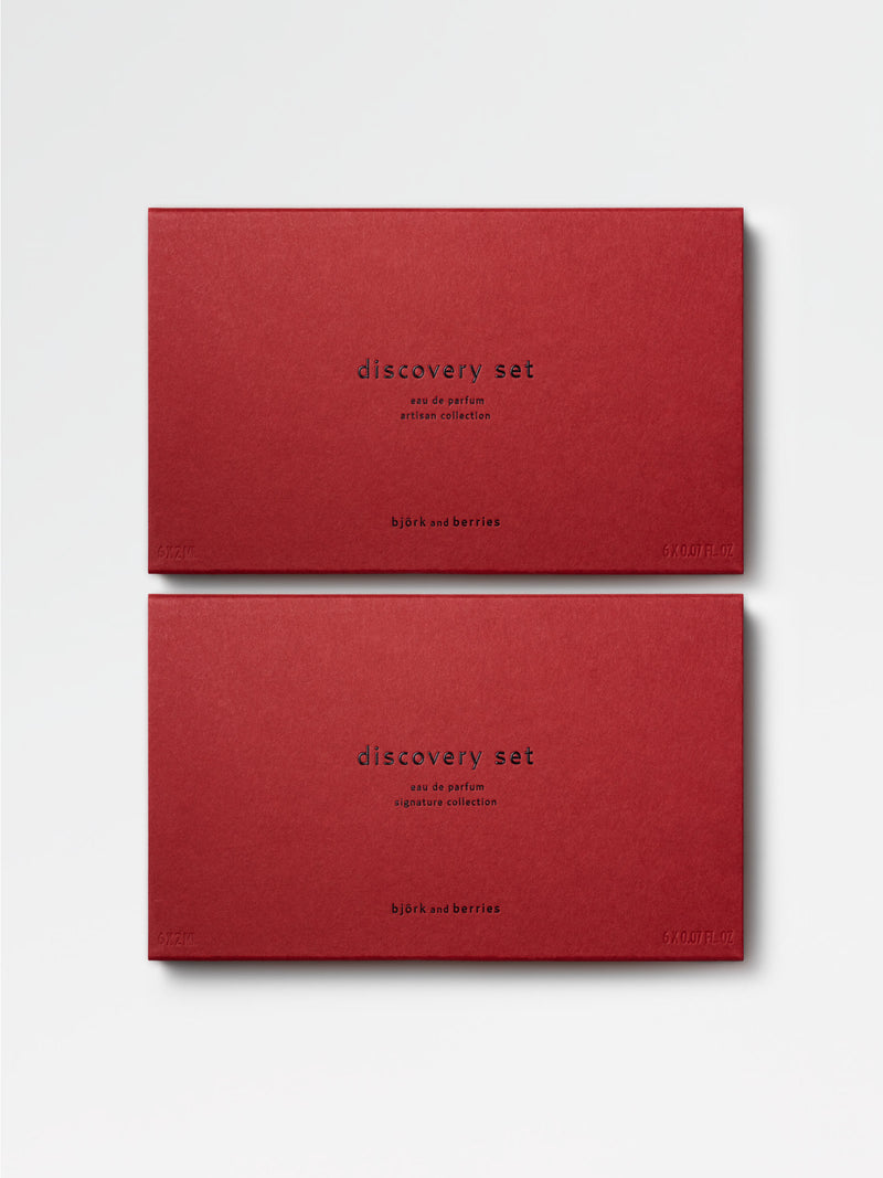 Enjoy a special gift! Two days after your Discovery Set purchase, you’ll receive two unique voucher codes via email, worth 390 SEK each, redeemable for two full-size Eau de Perfumes of your choice at bjorkandberries.com.